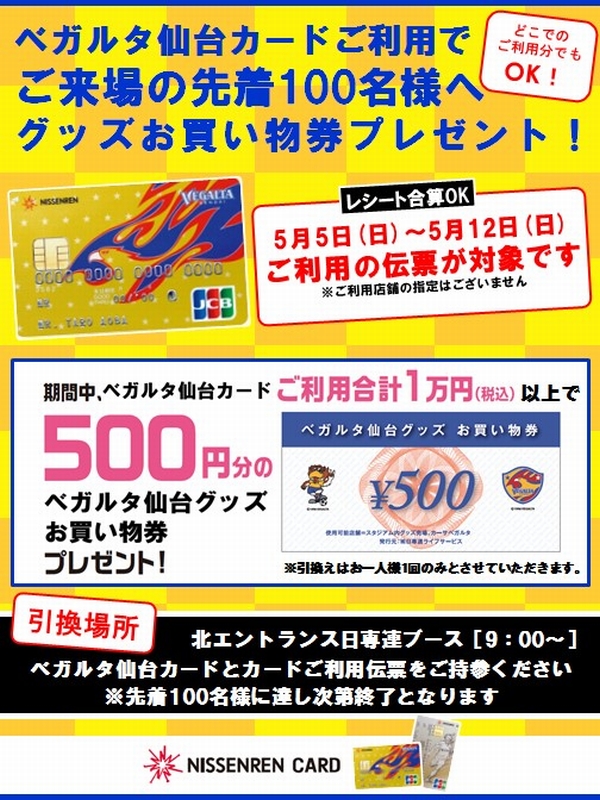【5月12日 J1 広島戦】【先着100名限定】ベガルタ仙台カードご利用の方にグッズお買い物券プレゼント!!