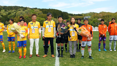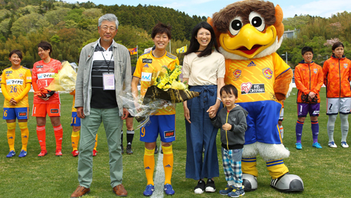 試合開始前のイベントとして、今節のマッチデースポンサー「CLA-T JAPAN」の皆さんによる花束贈呈、亀山絋石巻市長・浅野亨 石巻商工会議所会頭による始球式、小野瞳選手のなでしこリーグ通算100試合出場達成セレモニーとしてご家族から花束贈呈を行いました。