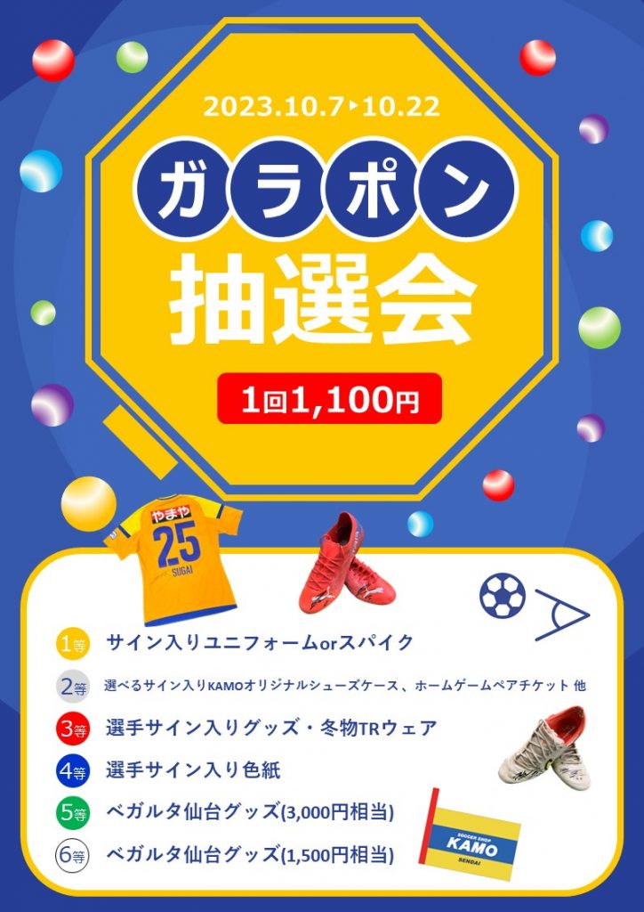 はずれなしで選手サイン入りグッズや、希望選手のサインが入ったサッカーショップKAMOオリジナルシューズケースなど豪華賞品が当たるかも!?上位賞をたくさん用意して、みなさまのご来店をお待ちしております。
