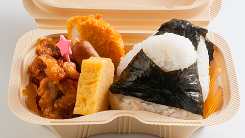 おいしいお米のおむすび(鮭・ツナマヨ)が1個ずつと唐揚げやウインナーなどのおかずも入ったお得な商品です。