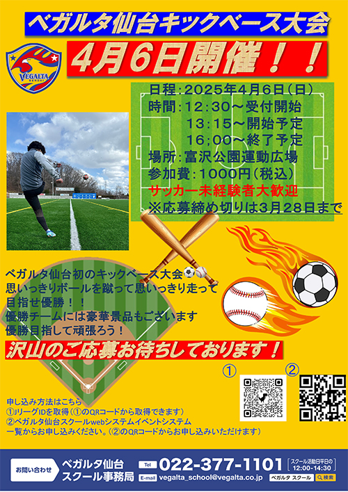 【サッカースクール】4月6日(日)ベガルタ仙台キックベース大会開催のお知らせ