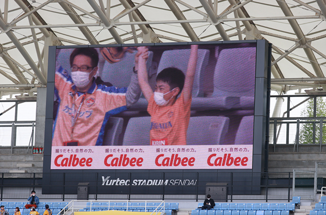 ——ホームゲームの試合日には“カルビースマイルタイム”と題して、ユアテックスタジアム仙台の大型ビジョンをとおして、サポーターの方々にアピールしてもらうイベントがあります。