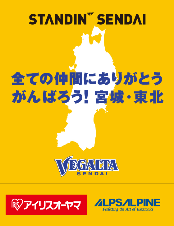 • 震災後、クラブは「がんばろう!宮城・東北」をスローガンに、覚悟を持って「希望の光になる」、懸命にプレーすることで被災地に勇気を届けるために戦いました。サポーターは、サッカーファミリーをはじめ、日本全国、世界中の方々からの応援、支援に感謝の意を込めて「全ての仲間にありがとう」と記した横断幕を掲出しました。